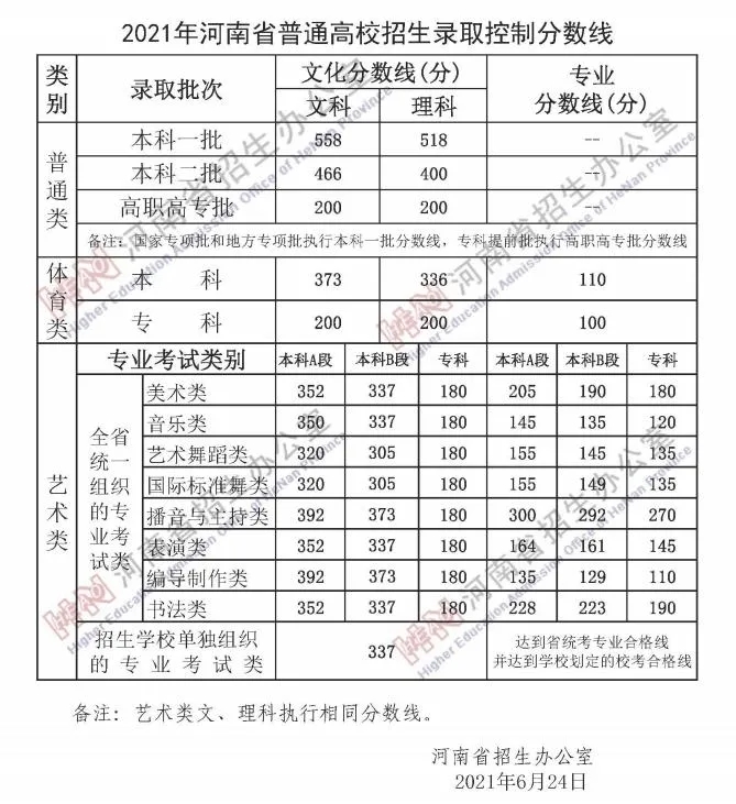 刚刚,河南省招生办公室公布了2021年河南省普通高招各批次录取控制分数线,详情如下: