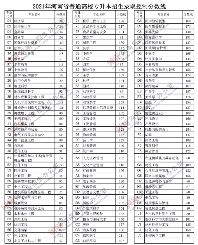 2021年河南省普通高校专升本招生录取控制分数线